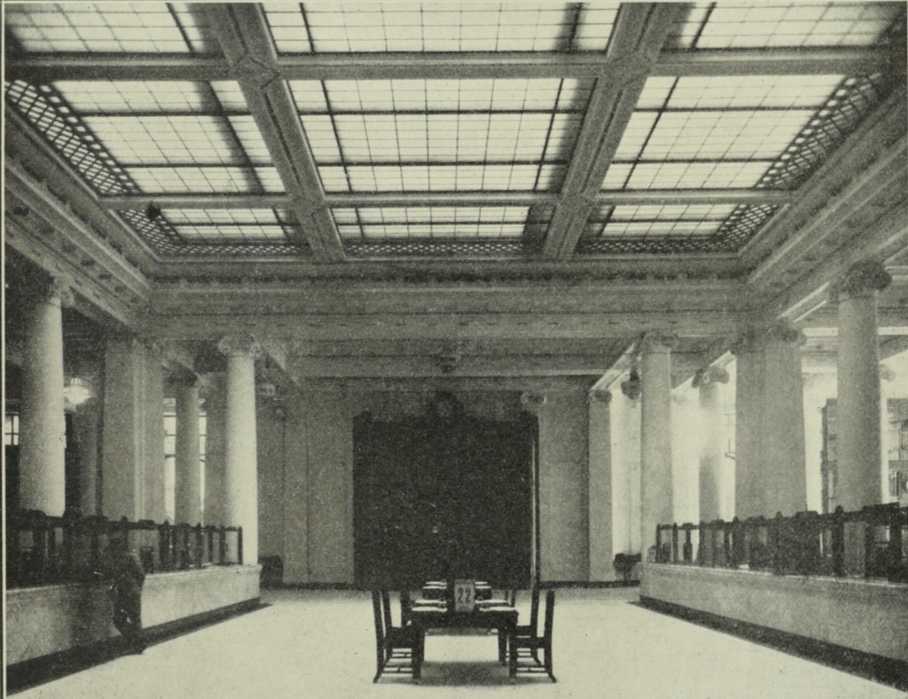 The coat of arms above the main entrance was designed and sculpted in beaten copper by William Macintosh. Electric clocks were installed, and the main clock in the banking chamber was inscribed with the words “The noiseless foot of time steals swiftly by”. Indeed.