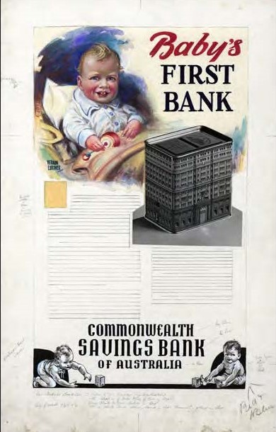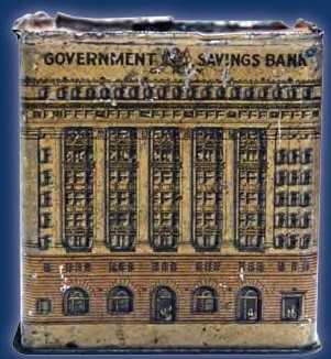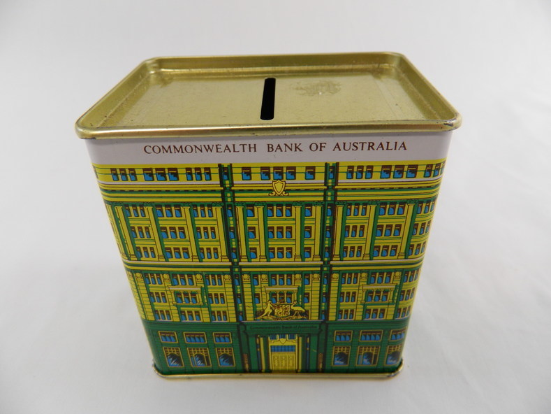 Interestingly there are two models of the money box. The other is the 1931 issued “pink money box” which featured the State Savings Bank building at 48 Martin Place acquired by the Bank. (Sydney Morning Herald “A telling tale of two money boxes” 26 September 2012 https://www.smh.com.au/national/nsw/a-telling-tale-of-two-tin-moneyboxes-20120925-26jfg.html